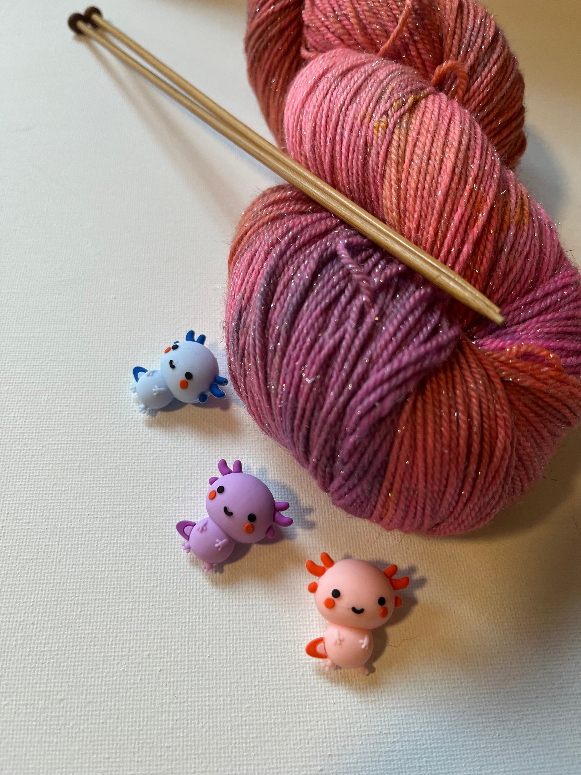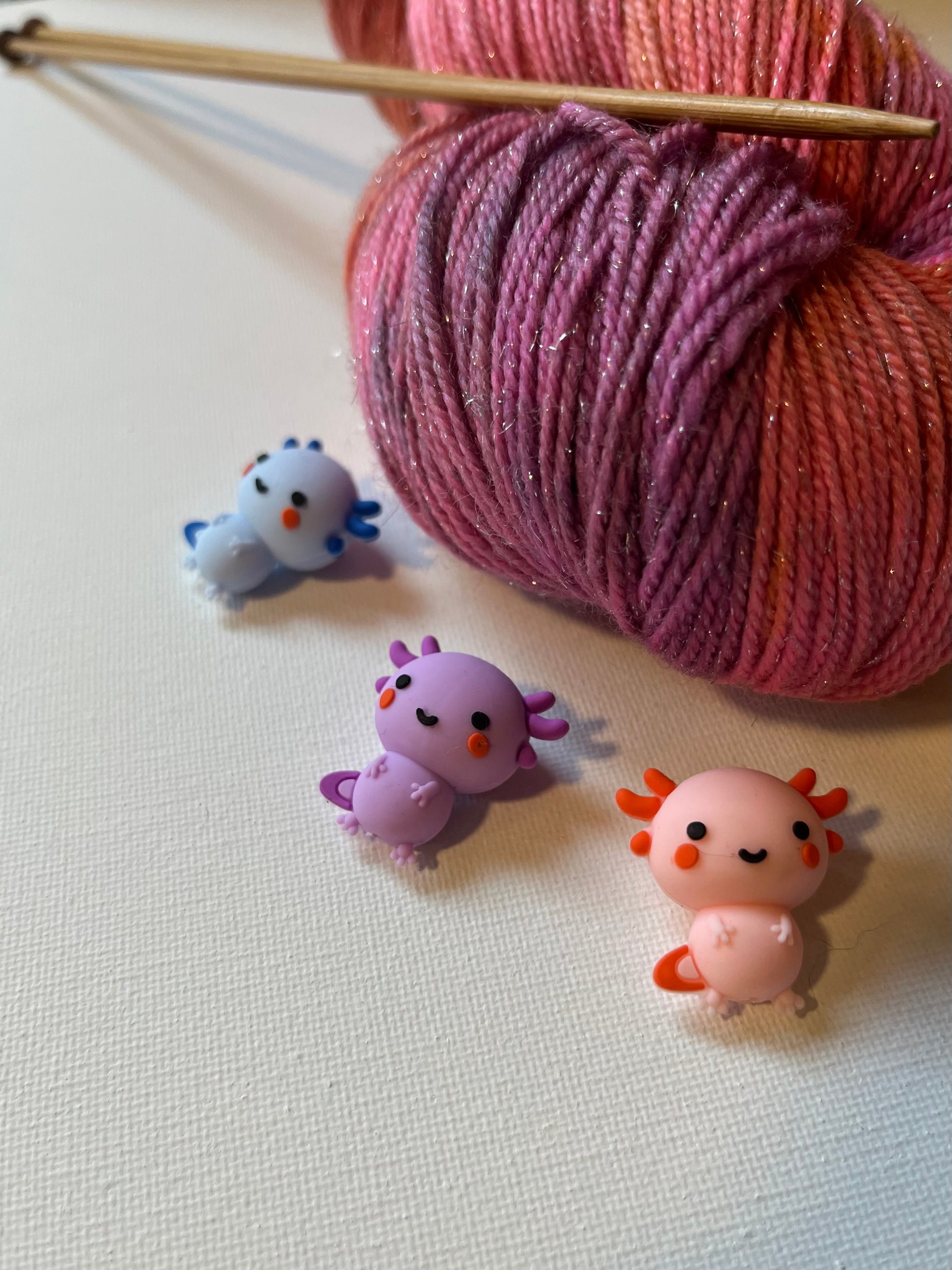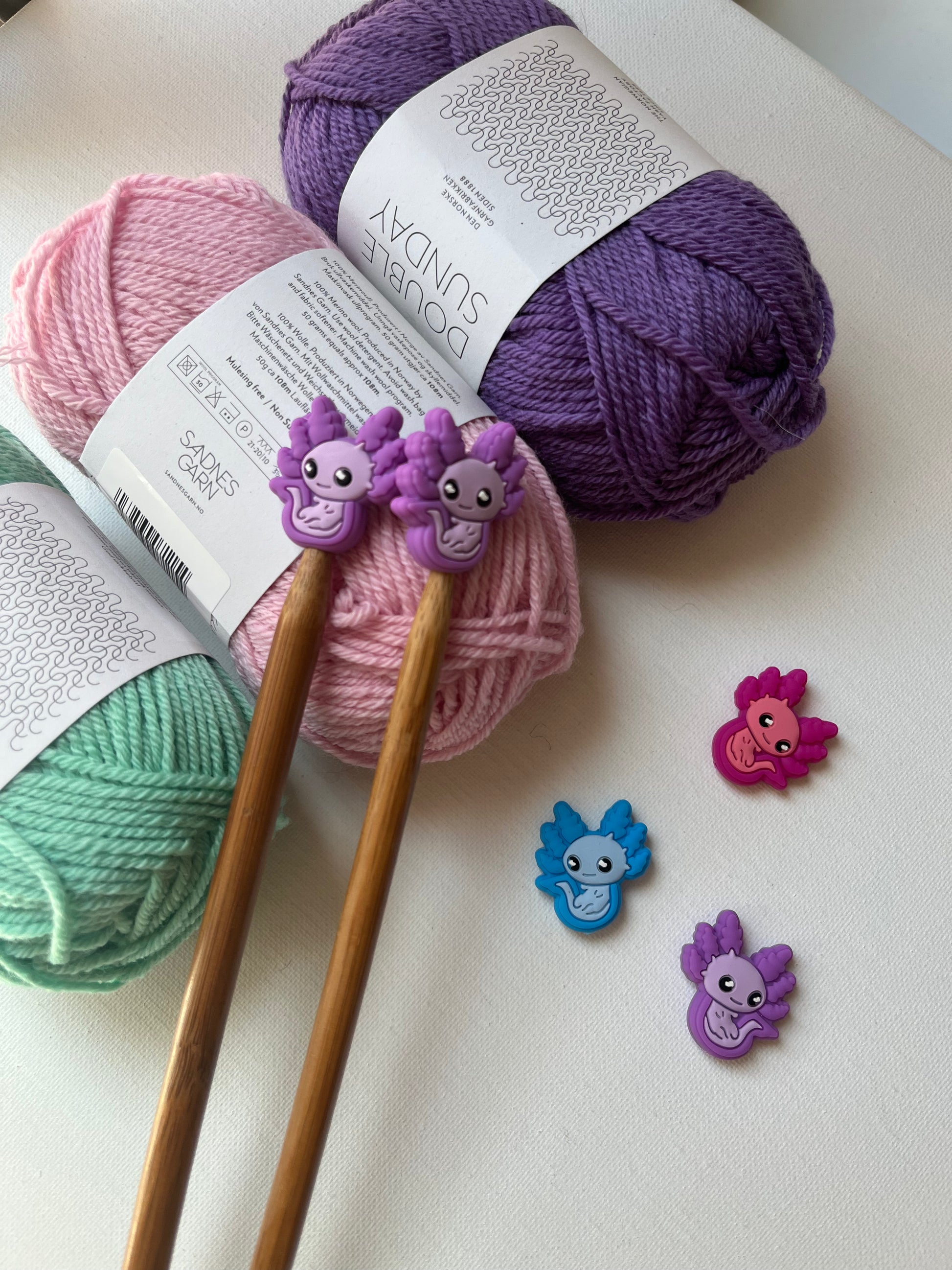 Keep your knitting project on track with Axolotl Stitch Stoppers. These stoppers fit US 2 (2.75 mm) to US 13 (9 mm) needles, ensuring your stitches stay in place. No more slipping or dropped stitches mean smoother, stress-free knitting. Perfect for beginners and experienced knitters alike.