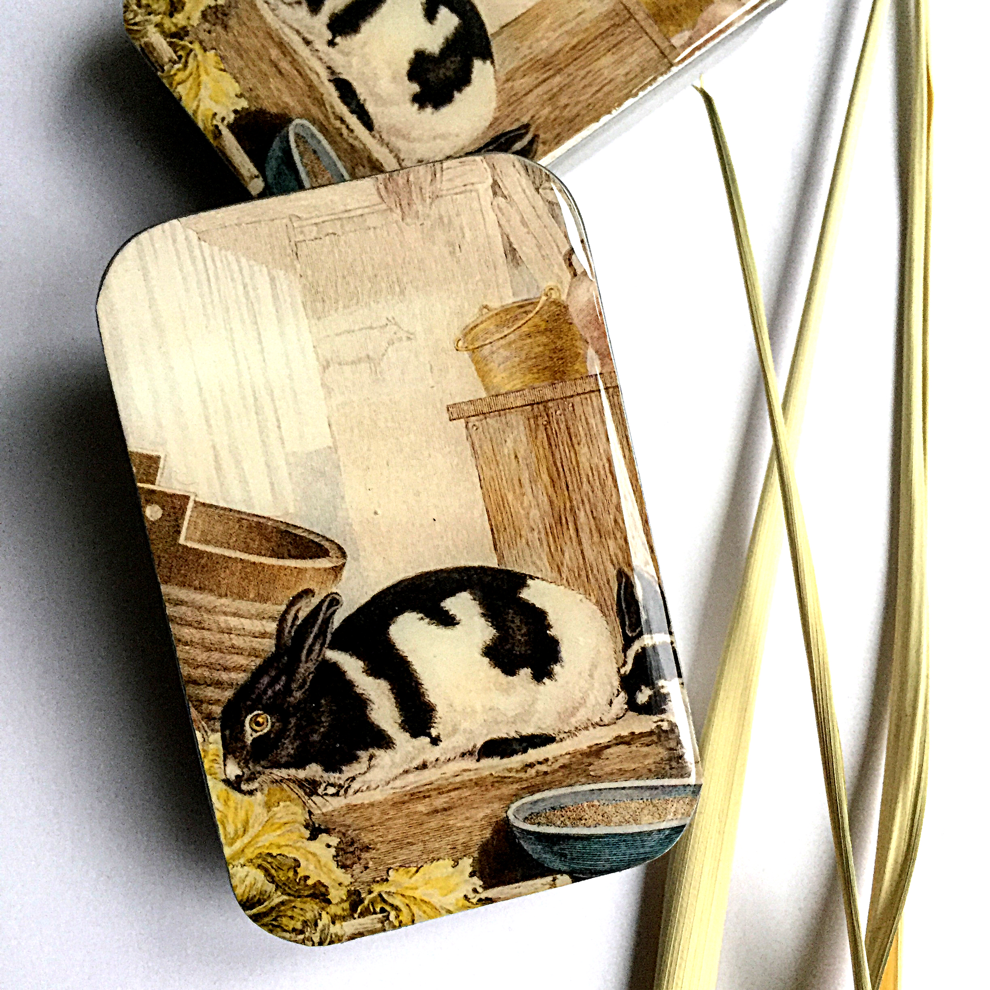 Sweet vintage rabbit image I cleaned up and crafted with a two part resin atop this handy slider tin. Hand Poured resin and small batch design from Steveston BC.