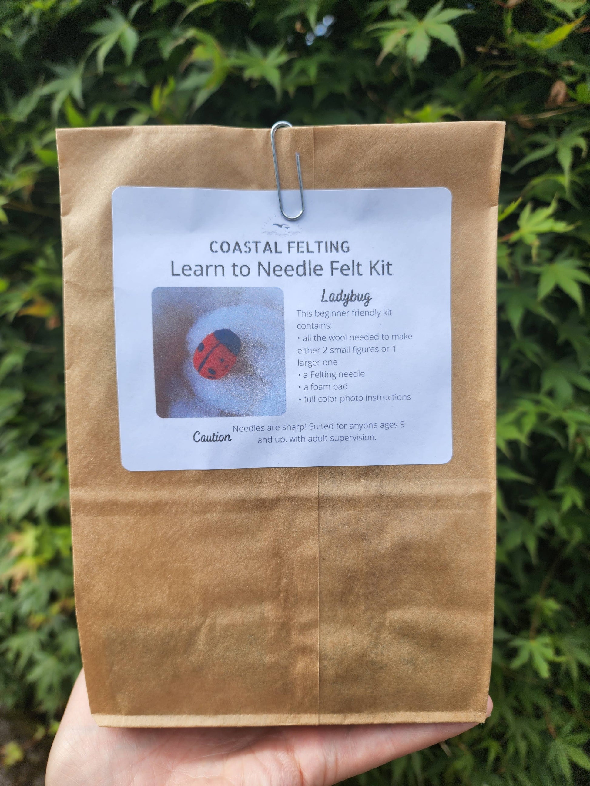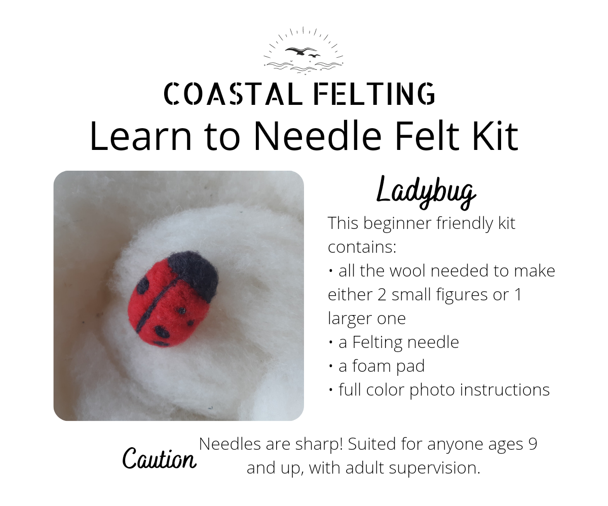 The kit includes: Instruction booklet with full color photos, a felting needle, a foam pad and all the wool needed for 2 or more little ladybugs!