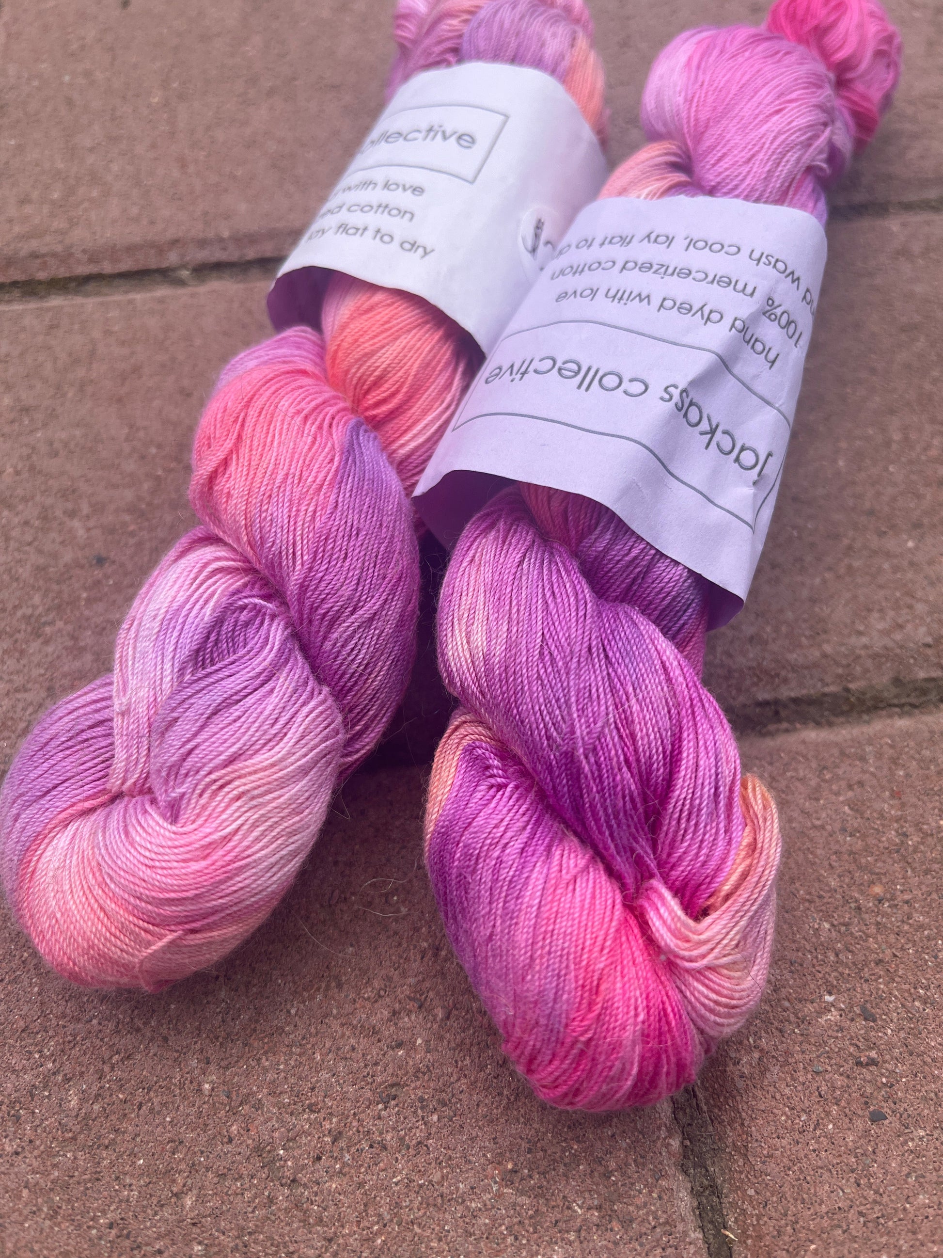 The symphony of pink yarn is hand dyed with love and made from 100% mercerized cotton.