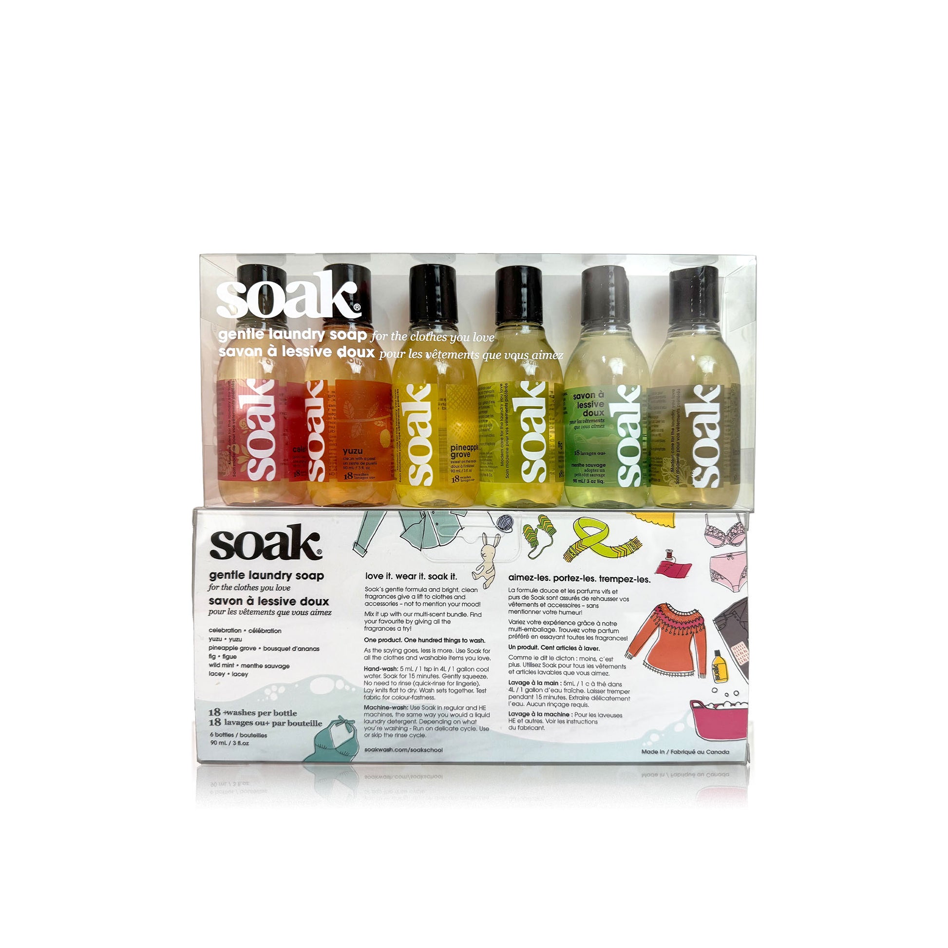 Six Soak fragrances (except Scentless) are now available in Soak’s brand-new SoakBox Sampler! All of Soak’s gentle scents in cute 3oz travel-size bottles – it’s the perfect introduction to Soak©.