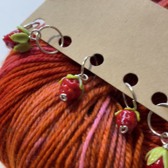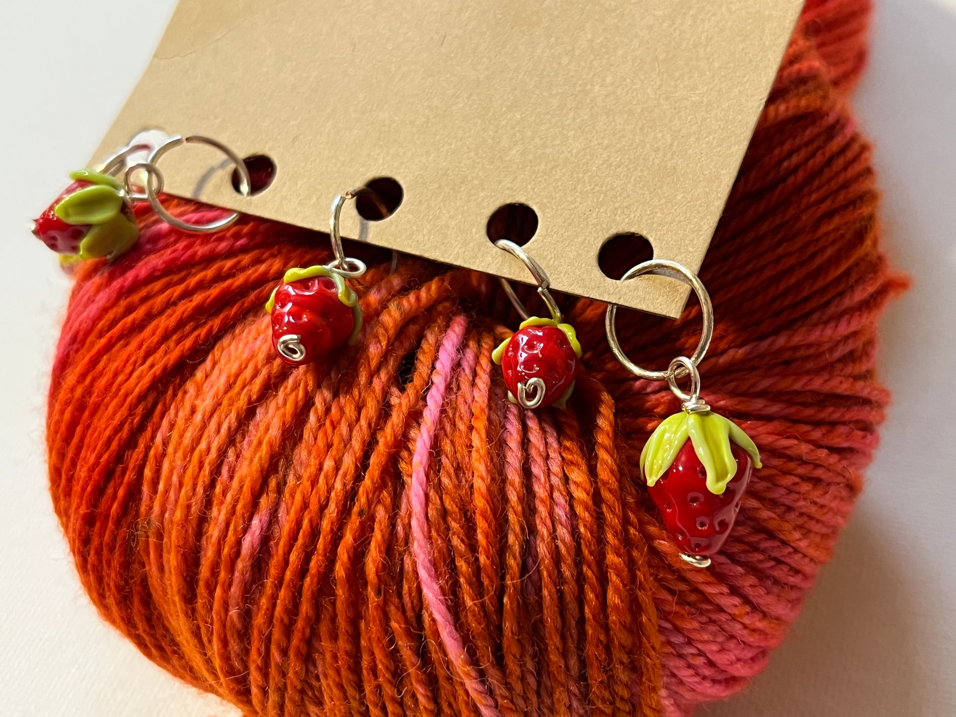 Expertly crafted glass lamp work, these Strawberry Glass Stitch Markers are perfect for any avid knitter. Made with precision and care, these markers are durable and easy to use. Add a touch of whimsy to your projects while keeping track of your stitches. A must-have for any knitting collection.