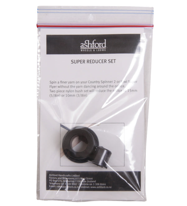 Spin a finer yarn on your Country Spinner 2 or Kiwi Super Flyer without the yarn dancing around the orifice. Two piece nylon bush set will reduce the orifice to 15mm (5/8″) or 10mm (3/8″).